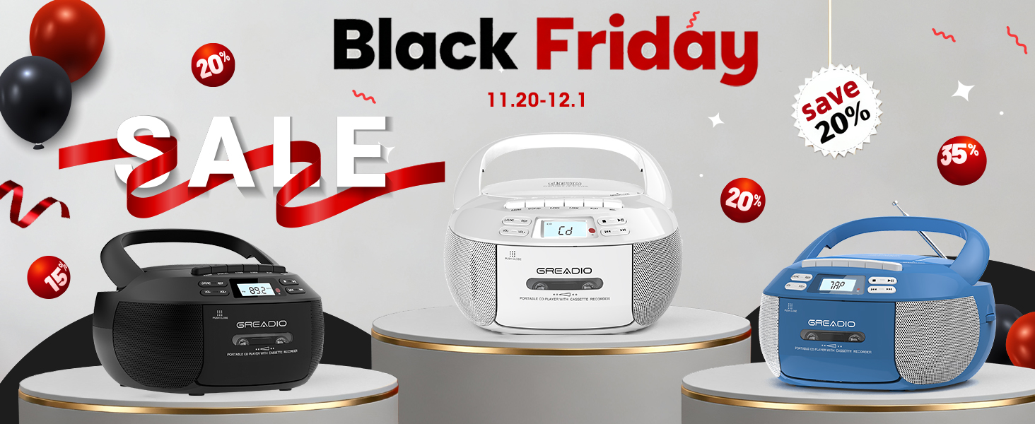 The GreadioCD Player Boombox is a sleek, multi-functional audio system combining CD, cassette, AM/FM radio, Bluetooth 5.1, USB, and AUX playback. Featuring 3W dual stereo speakers, remote control, LCD display, and dual power options (AC/DC and 6*C batteries), it delivers versatile, portable sound for home or on-the-go use. Perfect for millennials craving a blend of nostalgia and modern convenience.